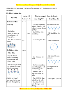 Phương pháp, tổ chức và yêu cầu Nội dung T. gian S. lần Hoạt động GV Hoạt động HS I. Phần mở đầu 5 – 7’ Nhận lớp - GV nhận lớp thăm Đội hình nhận lớp hỏi sức khỏe HS phổ biến nội dung, yêu cầu giờ học. - Khởi động - GV HD học sinh - Xoay các khớp cổ 2x8N - HS khởi động theo khởi động tay, cổ chân, vai, GV. hông, gối,... - Trò chơi “ Làm theo - GV hướng dẫn chơi 2-3’ - HS Chơi trò chơi. lời nói” II. Phần cơ bản: 16-18’ - Kiến thức. - Học di chuyển - Đội hình HS quan vượt qua chướng - Cho HS quan sát sát tranh ngại nhỏ, lớn trên tranh đường thẳng - Bài tập chuyển vượt - GV làm mẫu động qua chướng ngại nhỏ, - HS quan sát GV tác kết hợp phân tích trên đường thẳng làm mẫu kĩ thuật động tác. - Hô khẩu lệnh và thực hiện động tác mẫu - Bài tập di chuyển - Cho 2 HS lên thực - HS tiếp tục quan sát vượt qua chướng ngại hiện động tác mẫu lớn trên đường thẳng - GV cùng HS nhận xét, đánh giá tuyên dương
