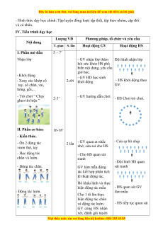 Phương pháp, tổ chức và yêu cầu Nội dung T. gian S. lần Hoạt động GV Hoạt động HS I. Phần mở đầu 5 – 7’ Nhận lớp - GV nhận lớp thăm Đội hình nhận lớp hỏi sức khỏe HS phổ biến nội dung, yêu cầu giờ học. - Khởi động - GV HD học sinh - Xoay các khớp cổ 2x8N - HS khởi động theo khởi động tay, cổ chân, vai, GV. hông, gối,... - Trò chơi “ Chạy - GV hướng dẫn chơi 2-3’ - HS Chơi trò chơi. gheo tín hiệu ” II. Phần cơ bản: 16-18’ - Kiến thức. - GV quan at nhắc