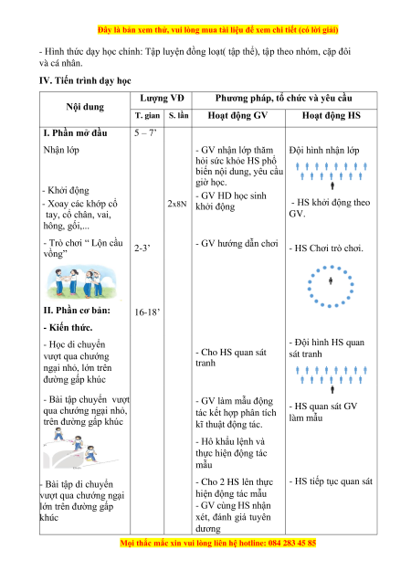 Phương pháp, tổ chức và yêu cầu Nội dung T. gian S. lần Hoạt động GV Hoạt động HS I. Phần mở đầu 5 – 7’ Nhận lớp - GV nhận lớp thăm Đội hình nhận lớp hỏi sức khỏe HS phổ biến nội dung, yêu cầu giờ học. - Khởi động - GV HD học sinh - Xoay các khớp cổ 2x8N - HS khởi động theo khởi động tay, cổ chân, vai, GV. hông, gối,... - Trò chơi “ Lộn cầu - GV hướng dẫn chơi 2-3’ - HS Chơi trò chơi. vồng” II. Phần cơ bản: 16-18’ - Kiến thức. - Đội hình HS quan - Học di chuyển - Cho HS quan sát sát tranh vượt qua chướng ngại nhỏ, lớn trên tranh đường gấp khúc - Bài tập chuyển vượt - GV làm mẫu động - HS quan sát GV qua chướng ngại nhỏ,