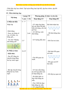 Phương pháp, tổ chức và yêu cầu Nội dung T. gian S. lần Hoạt động GV Hoạt động HS I. Phần mở đầu 5 – 7’ Nhận lớp - GV nhận lớp thăm Đội hình nhận lớp hỏi sức khỏe HS phổ biến nội dung, yêu cầu giờ học. - Khởi động - GV HD học sinh - Xoay các khớp cổ 2x8N - HS khởi động theo khởi động tay, cổ chân, vai, GV. hông, gối,... - Trò chơi “Hoàng - GV hướng dẫn chơi 2-3’ - HS Chơi trò chơi. anh hoàng yến” II. Phần cơ bản: 16-18’ - Đội hình HS quan - Kiến thức. sát tranh - Học BT động tác - Cho HS quan sát chuyền bóng bằng tranh hai tay trước ngực - HS quan sát GV làm mẫu - Bài tập chuyền bóng - GV làm mẫu động bằng hai tay trước tác kết hợp phân tích ngực kĩ thuật động tác. - HS tiếp tục quan sát - Hô khẩu lệnh và thực hiện động tác mẫu - Cho 2 HS lên thực hiện động tác mẫu - GV cùng HS nhận