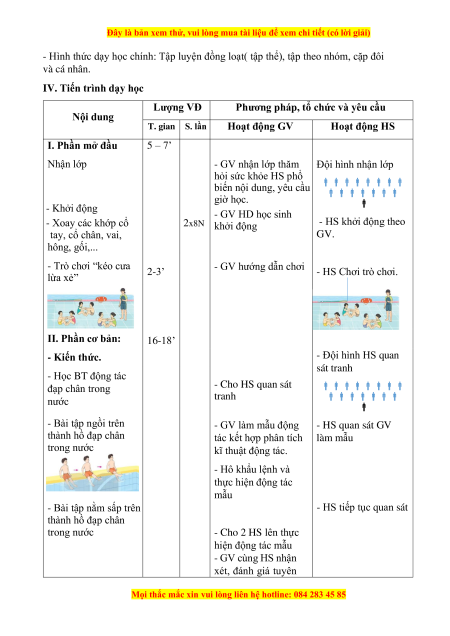 Phương pháp, tổ chức và yêu cầu Nội dung T. gian S. lần Hoạt động GV Hoạt động HS I. Phần mở đầu 5 – 7’ Nhận lớp - GV nhận lớp thăm Đội hình nhận lớp hỏi sức khỏe HS phổ biến nội dung, yêu cầu giờ học. - Khởi động - GV HD học sinh - Xoay các khớp cổ 2x8N - HS khởi động theo khởi động tay, cổ chân, vai, GV. hông, gối,... - Trò chơi “kéo cưa - GV hướng dẫn chơi 2-3’ - HS Chơi trò chơi. lừa xẻ” II. Phần cơ bản: 16-18’ - Đội hình HS quan - Kiến thức. sát tranh - Học BT động tác - Cho HS quan sát đạp chân trong tranh nước - Bài tập ngồi trên - GV làm mẫu động - HS quan sát GV thành hồ đạp chân