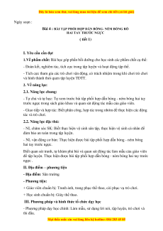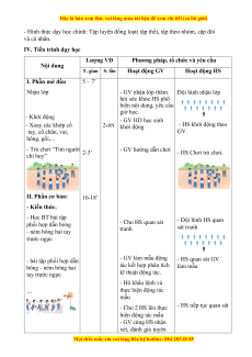 Phương pháp, tổ chức và yêu cầu Nội dung T. gian S. lần Hoạt động GV Hoạt động HS I. Phần mở đầu 5 – 7’ Nhận lớp - GV nhận lớp thăm Đội hình nhận lớp hỏi sức khỏe HS phổ biến nội dung, yêu cầu giờ học. - Khởi động - GV HD học sinh - Xoay các khớp cổ 2x8N - HS khởi động theo khởi động tay, cổ chân, vai, GV. hông, gối,... - Trò chơi “Tìm người - GV hướng dẫn chơi 2-3’ - HS Chơi trò chơi. chỉ huy” II. Phần cơ bản: 16-18’ - Kiến thức. - Học BT bài tập - Đội hình HS quan phối hợp dẫn bóng - Cho HS quan sát sát tranh tranh - ném bóng hai tay trước ngực - GV làm mẫu động - HS quan sát GV