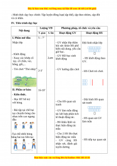 - Trò chơi “Thỏ nhảy” 2-3’ - GV hướng dẫn chơi - HS Chơi trò chơi. II. Phần cơ bản: 16-18’ - Kiến thức. - Học BT bổ trợ - Đội hình HS quan với bóng - Cho HS quan sát sát tranh tranh - Bài tập tại chỗ hai - GV làm mẫu động tay chuyền bóng cho tác kết hợp phân tích nhau trên cao ngang kĩ thuật động tác. - HS quan sát GV đầu làm mẫu - Hô khẩu lệnh và thực hiện động tác mẫu -Tại chỗ nhồi bóng - Cho 2 HS lên thực bằng hai tay liên tục hiện động tác mẫu - HS tiếp tục quan sát - GV cùng HS nhận xét, đánh giá tuyên dương