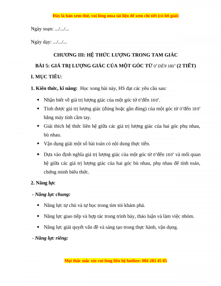BÀI 5: GIÁ TRỊ LƯỢNG GIÁC CỦA MỘT GÓC TỪ 0o ĐẾN 180o (2 TIẾT) I. MỤC TIÊU:
