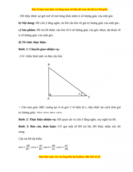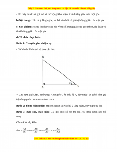 Bước 3: Báo cáo, thảo luận: GV gọi một số HS trả lời, HS khác nhận xét, bổ sung. Câu trả lời dự kiến: AB AC AB AC sin α= , cos α= ,tan α= ,cot α= BC BC AC AB