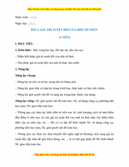 BÀI 3: GIÁ TRỊ TUYỆT ĐỐI CỦA MỘT SỐ THỰC (2 TIẾT) I. MỤC TIÊU: