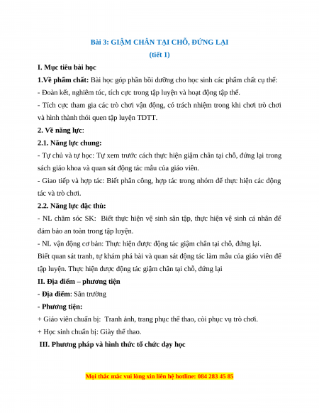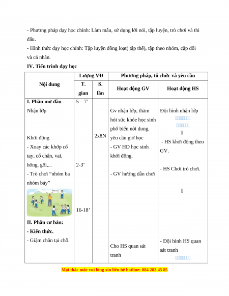 - Phương pháp dạy học chính: Làm mẫu, sử dụng lời nói, tập luyện, trò chơi và thi đấu.