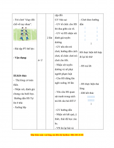 Phương pháp, tổ chức và yêu cầu Nội dung T. S. Hoạt động GV Hoạt động HS gian lần I. Phần mở đầu 5 – 7’ Nhận lớp Gv nhận lớp, thăm Đội hình nhận lớp hỏi sức khỏe học sinh phổ biến nội dung, Khởi động 2x8N yêu cầu giờ học - HS khởi động theo - Xoay các khớp cổ - GV HD học sinh GV. tay, cổ chân, vai, khởi động. hông, gối,... 2-3’ - HS Chơi trò chơi. - Trò chơi “nhóm ba - GV hướng dẫn chơi nhóm bảy” 16-18’ II. Phần cơ bản: - Kiến thức. - Giậm chân tại chỗ. - Đội hình HS quan Cho HS quan sát sát tranh tranh