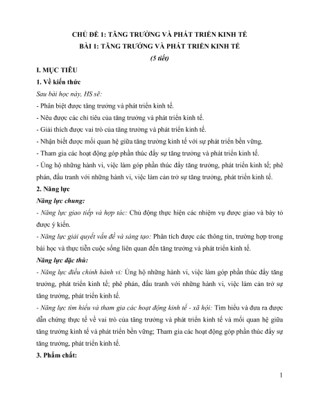 BÀI 1: TĂNG TRƯỞNG VÀ PHÁT TRIỂN KINH TẾ (5 tiết) I. MỤC TIÊU 1. Về kiến thức