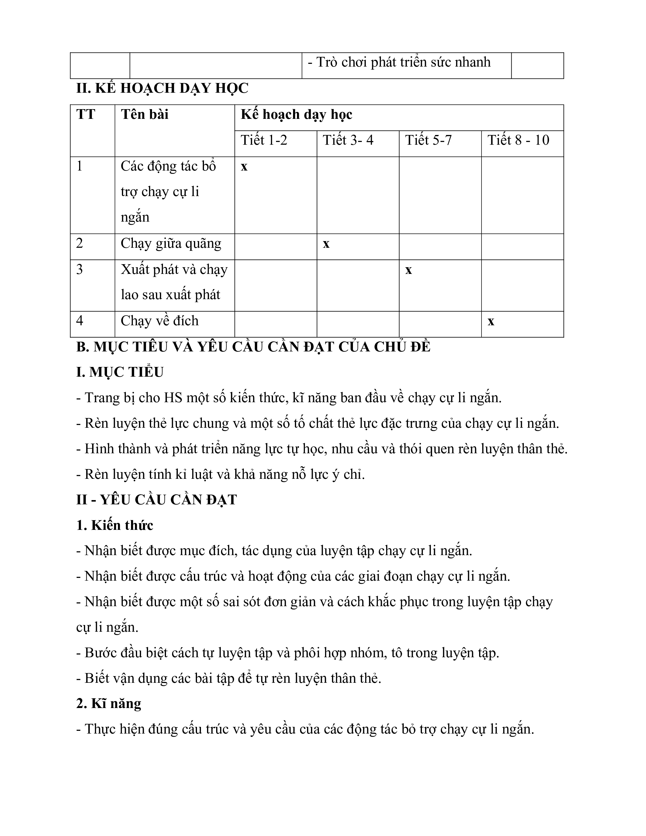 II. KẾ HOẠCH DẠY HỌC TT Tên bài Kế hoạch dạy học Tiết 1-2 Tiết 3- 4 Tiết 5-7 Tiết 8 - 10 1 Các động tác bổ x trợ chạy cự li ngắn 2 Chạy giữa quãng x 3 Xuất phát và chạy x lao sau xuất phát 4 Chạy về đích x
