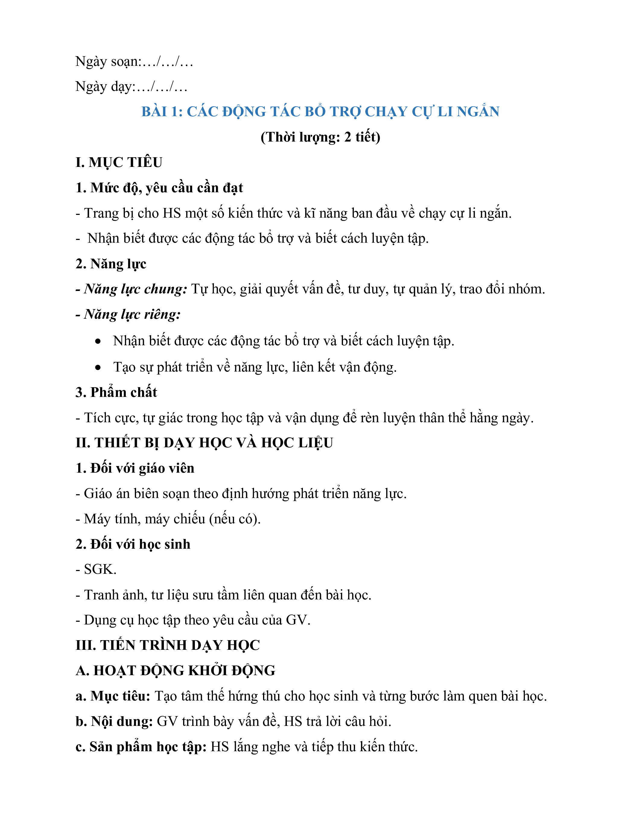 BÀI 1: CÁC ĐỘNG TÁC BỔ TRỢ CHẠY CỰ LI NGẮN