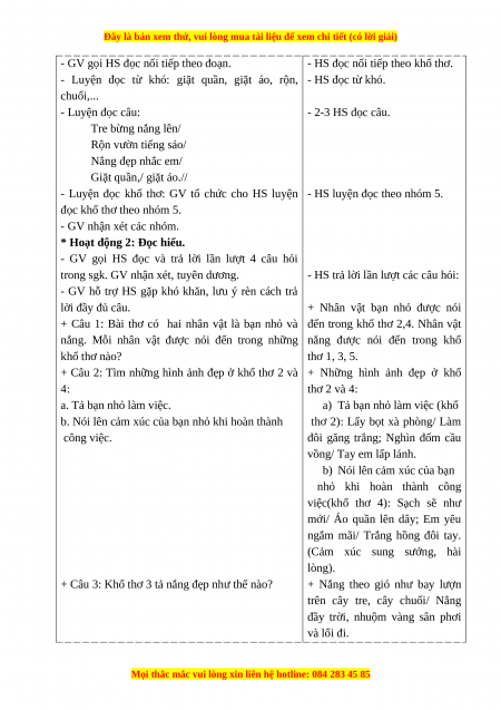- Luyện đọc từ khó: giặt quần, giặt áo, rộn, - HS đọc từ khó. chuối,... - Luyện đọc câu: - 2-3 HS đọc câu. Tre bừng nắng lên/ Rộn vườn tiếng sáo/ Nắng đẹp nhắc em/ Giặt quần,/ giặt áo.//