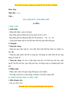 Ngày dạy: .../.../... L p: ớ ... BÀI: GI , Ờ PHÚT, XEM Đ N Ồ G HỒ (3 TIẾT) I. M C Ụ TIÊU 1. Ki n t ế h c ứ - Nh n bi ậ t ế được 1 gi có 60 phút ờ . - Đ c đ ọ ư c ợ gi t ờ rên đ ng h ồ khi ồ kim phút ch s ỉ 3, s ố 6. ố Đ c ọ đư c gi ợ ờ trên đồng hồ đi n t ệ v ử i ớ s phút ố là : 00, : 15, : 30. - Gi i ả quy t ế đư c ợ m t ộ s v ố n đ ấ t ề h c t ự i n l ễ iên quan đ n t ế h i ờ gian. 2. Năng l c ự