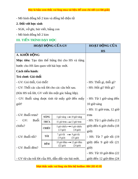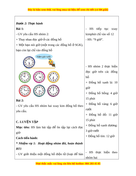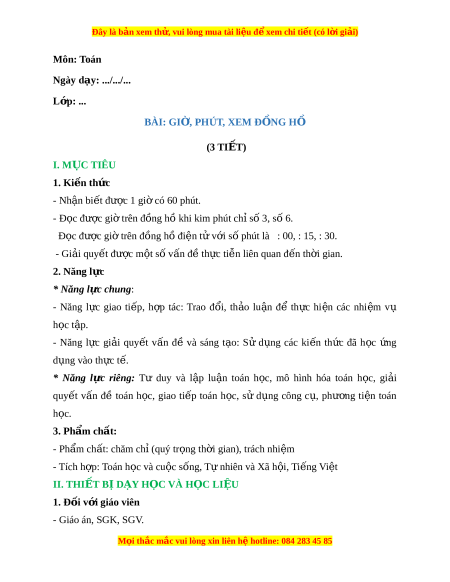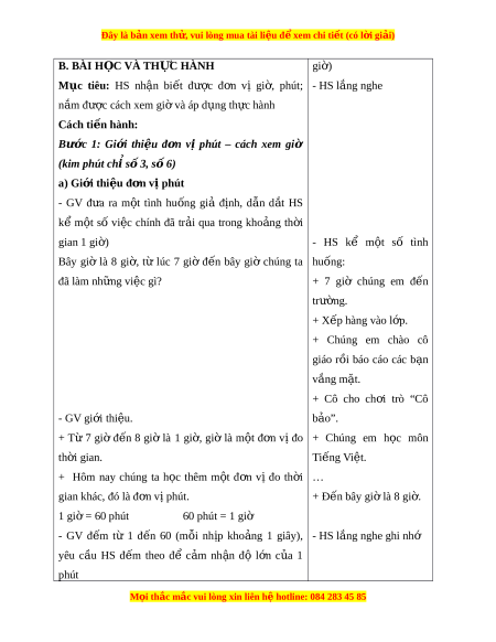 Đây là bản xem th , vu ử i lòng mua tài li u ệ đ xe ể m chi ti t (c ế ó l i ờ gi i ả ) B. BÀI H C Ọ VÀ TH C Ự HÀNH gi ) ờ Mục tiêu: HS nh n ậ bi t ế đư c ợ đ n ơ vị gi , ờ phút; - HS l ng ắ nghe n m ắ đư c cách ợ xem gi và áp d ờ ng ụ th c ự hành Cách ti n hà ế nh: Bước 1: Gi i ớ thi u ệ đ n