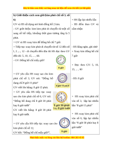 Đây là bản xem th , vu ử i lòng mua tài li u ệ đ xe ể m chi ti t (c ế ó l i ờ gi i ả ) b) Gi i ớ thi u ệ cách xem gi ờ (kim phút ch ỉ s ố 3, số 6) + HS l p l ặ i ạ nhi u l ề n ầ GV và HS sử d ng m ụ ô hình đ ng h ồ 2 ki ồ m. - HS đ m ế theo GV và - GV gi i ớ thi u: ệ kim kim phút di chuy n ể từ m t ộ số c m ả nh n ậ sang số kế ti p, ế kho ng ả th i ờ gian tư ng ơ ng ứ là 5 phút. + GV và HS xoay kim đ đ ể ồng hồ ch 7 gi ỉ . ờ + Ti p t ế c ụ xoay kim phút di chuy n ể t ừ s ố 12 đ n ế số - HS l ng ắ nghe, ghi nh ớ l, 2 ,..., 12 - di chuy n ể đ n ế đâu thì HS đ c ọ theo GV + Xoay kim đ ng ồ hồ chỉ đ n đó: ế 5, 10, 15, ... , 60. 7 giờ - GV: Đồng hồ ch m ỉ ấy gi ? ờ + Đ c ọ theo GV: 5, 10, 15, ... , 60 + GV yêu c u ầ HS xoay sao cho kim