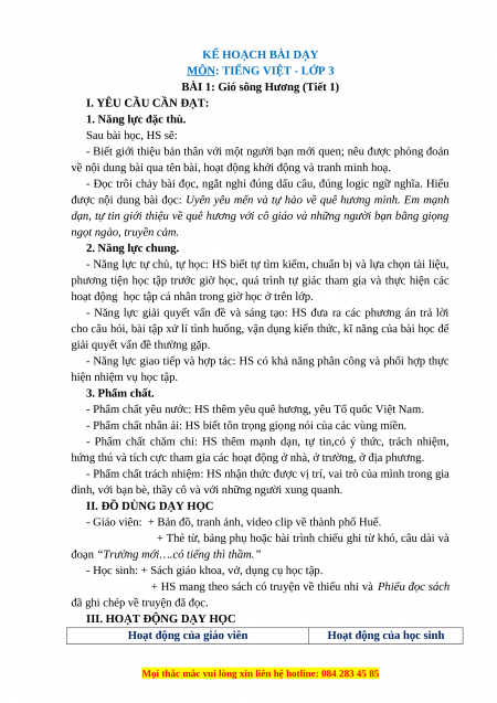 BÀI 1: Gió sông Hương (Tiết 1) I. YÊU CẦU CẦN ĐẠT: 1. Năng lực đặc thù. Sau bài học, HS sẽ: