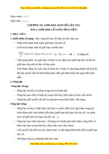 Đây là bản xem th , vu ử i lòng mua tài li u ệ đ xe ể m chi ti t ế (có l i ờ gi i ả ) Ngày so n ạ : .../.../... Ngày d y ạ : .../.../... CHƯƠNG III: GI I Ớ H N Ạ . HÀM S Ố LIÊN T C Ụ BÀI 1: GI I Ớ H N Ạ C A Ủ DÃY S Ố (2 TI T) Ế I. MỤC TIÊU: 1. Ki n ế th c