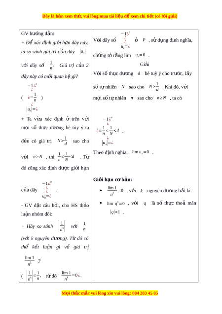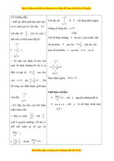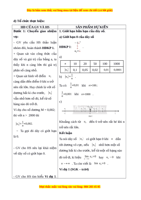 Đây là bản xem th , vu ử i lòng mua tài li u ệ đ xe ể m chi ti t ế (có l i ờ gi i ả ) d) T ổ ch c ứ th c ự hi n: ệ HĐ CỦA GV VÀ HS SẢN PHẨM D Ự KI N Ế Bư c ớ 1: Chuy n ể giao nhi m ệ 1. Gi i ớ h n ạ h u ữ h n ạ c a ủ dãy s . ố v : ụ a) Gi i ớ h n ạ 0 c a ủ dãy số - GV yêu c u ầ HS th o ả lu n ậ n −1¿ ¿