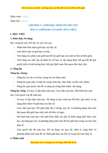 BÀI 15: GIỚI HẠN CỦA DÃY SỐ (2 TIẾT) I. MỤC TIÊU: