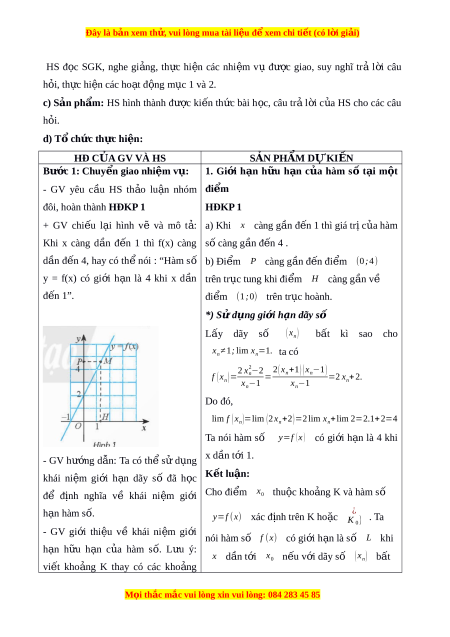Đây là bản xem th , vu ử i lòng mua tài li u ệ đ xe ể m chi ti t ế (có l i ờ gi i ả ) - Mô hình hóa toán h c ọ : Gi i ả quy t ế m t ộ s ố v n ấ đ ề th c ự ti n ế g n ắ v i ớ gi i ớ h n ạ c a ủ hàm s . ố - Gi i ả quy t ế v n ấ đề toán h c ọ : tính đ c ượ m t ộ số gi i ớ h n ạ b n ằ g cách v n ậ d n ụ g các phép toán trên gi i ớ h n ạ và các gi i ớ h n ạ c ơ b n ả . - Giao ti p ế toán h c ọ : đ c ọ , hi u ể , trao đ i ổ thông tin toán h c. ọ - S ử d n ụ g công c , ụ ph n ươ g ti n ệ h c ọ toán. 3. Ph m ẩ ch t ấ - Cóý th c ứ h c ọ t p ậ , ý th c