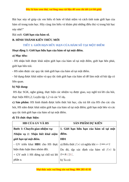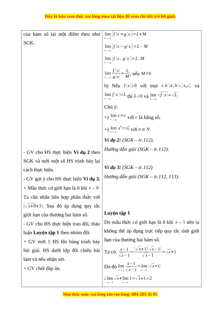 - Sử dụng được khái niệm và quy tắc tính giới hạn của hàm số để làm một số bài tập có liên quan. b) Nội dung: