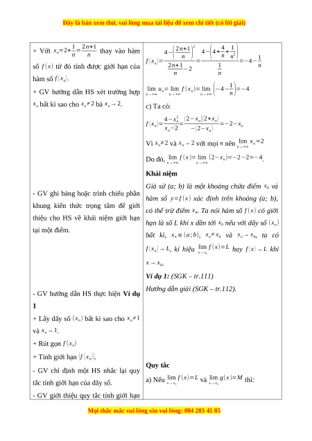 + GV hướng dẫn HS xét trường hợp lim u = lim f (x )= lim n n (−4−1)=−4 n →+∞ n →+∞ n →+∞ n x ≠ 2 → 2