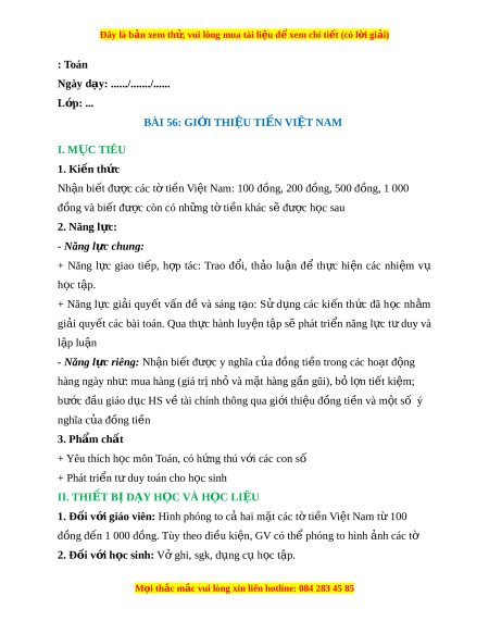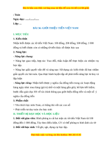 Ngày dạy: ....../......./...... L p: ớ ... BÀI 56: GIỚI THI U Ệ TI N Ề VI T Ệ NAM I. M C Ụ TIÊU 1. Ki n t ế h c ứ Nh n ậ bi t ế đư c các ợ t t ờ i n ề Vi t ệ Nam: 100 đ ng, 200 đ ồ ng, 500 đ ồ ng, 1 000 ồ đồng và bi t ế đư c ợ còn có nh ng t ữ t ờ i n khác ề s đ ẽ ư c ợ h c s ọ au 2. Năng l c: ự - Năng l c ự chung: + Năng l c ự giao ti p, ế h p ợ tác: Trao đ i ổ , th o ả lu n ậ để th c ự hi n ệ các nhi m ệ vụ h c ọ t p. ậ + Năng l c ự gi i ả quy t ế v n ấ đ ề và sáng t o: ạ S ử d ng ụ các ki n ế th c ứ đã h c ọ nh m ằ gi i ả quy t