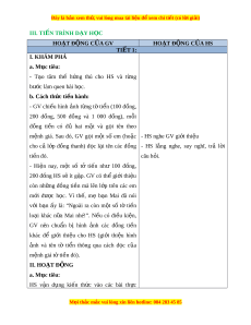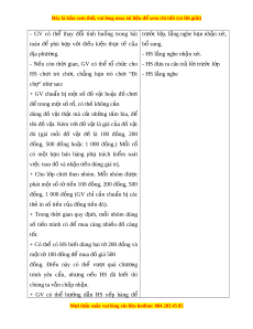 Đây là bản xem th , vu ử i lòng mua tài li u ệ đ xe ể m chi ti t (c ế ó l i ờ gi i ả ) III. TI N Ế TRÌNH D Y Ạ H C Ọ HOẠT Đ N Ộ G C A Ủ GV HOẠT Đ N Ộ G C A Ủ HS TIẾT 1: I. KHÁM PHÁ a. Mục tiêu: - T o ạ tâm thế h ng ứ thú cho HS và t ng ừ bư c ớ làm quen bài h c. ọ b. Cách th c ứ ti n hàn ế h: - GV chi u ế hình nh ả t ng ừ t ờ ti n ể (100 đ ng, ồ 200 đ ng, ồ 500 đ ng ồ và 1 000 đ ng) ồ , m i ỗ đồng ti n ề có đủ hai m t ặ và g i ọ tên theo mệnh giá. Sau đó, GV g i ọ m t ộ số em (ho c ặ - HS nghe GV gi i ớ thi u ệ cho cả l p ớ đ ng ồ thanh) đ c ọ l i ạ tên các đ ng ồ - HS l ng ắ nghe, suy nghĩ, trả l i ờ ti n đó. ề câu h i ỏ . - Hi n ệ nay, m t ộ số tở ti n ế như 100 đ ng, ồ 200 đ ng ồ HS sẽ ít g p. ặ GV có th ể gi i ớ thi u ệ còn nh ng ữ đ ng ồ ti n ề mà lên l p ớ trên các em m i ớ đư c ợ h c. ọ Vì th , ế mẹ b n ạ Mai đã nói v i ớ b n ạ y ấ là: “Ngoài ra còn m t ộ số tờ ti n ề lo i ạ khác n a ữ Mai nhé!”. N u ế có đi u ề ki n, ệ GV nên chu n ẩ bị hình nh ả các đ ng ồ ti n ề khác để gi i ớ thi u ệ cho HS (gi i ớ thi u ệ hình nh ả và tên tờ ti n ể thông qua cách đ c ọ c a ủ mệnh giá t t ờ i n đó) ề . II. HOẠT Đ N Ộ G a. Mục tiêu: HS v n ậ d ng ụ ki n ế th c ứ vào các bài th c ự M i