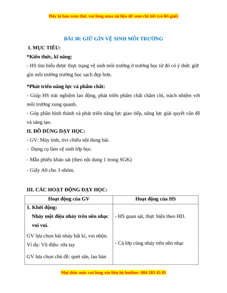 BÀI 30: GIỮ GÌN VỆ SINH MÔI TRƯỜNG I. MỤC TIÊU: