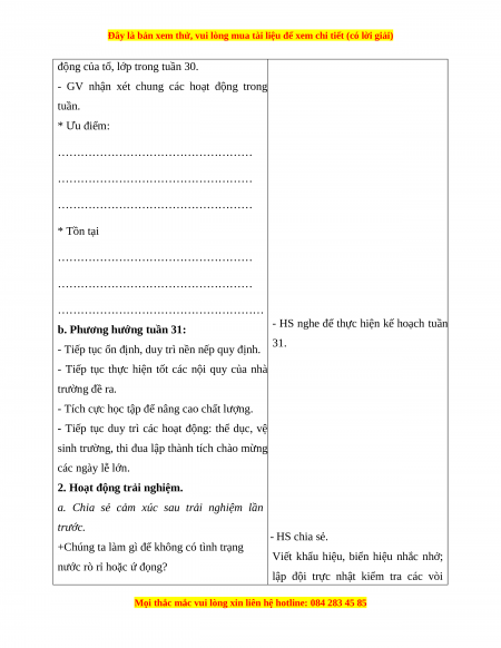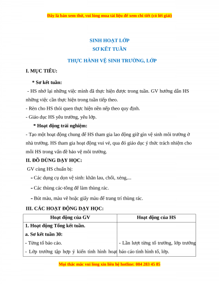 1. Hoạt động Tổng kết tuần. a. Sơ kết tuần 30: