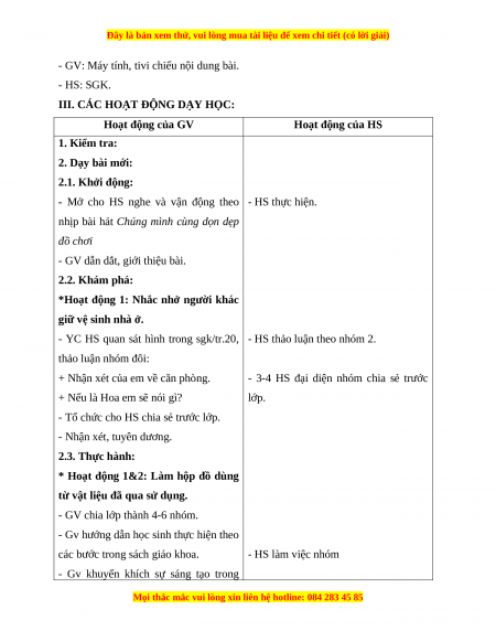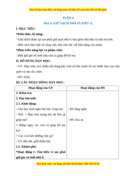 BÀI 4: GIỮ SẠCH NHÀ Ở (TIẾT 1) I. MỤC TIÊU: