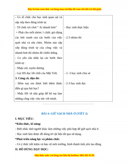 BÀI 4: GIỮ SẠCH NHÀ Ở (TIẾT 2) I. MỤC TIÊU: