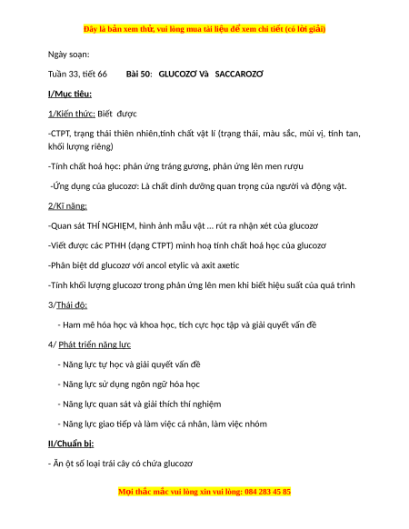 Tuần 33, tiết 66 Bài 50: GLUCOZƠ Và SACCAROZƠ I/Mục tiêu: