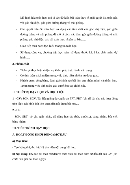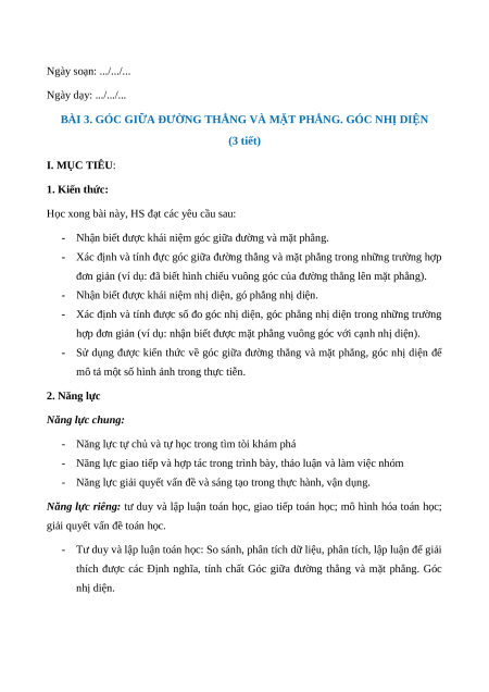 BÀI 3. GÓC GIỮA ĐƯỜNG THẲNG VÀ MẶT PHẲNG. GÓC NHỊ DIỆN (3 tiết) I. MỤC TIÊU: