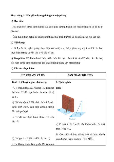 Hoạt động 1: Góc giữa đường thẳng và mặt phẳng a) Mục tiêu: