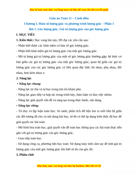 Bài 1. Góc lượng giác. Giá trị lượng giác của góc lượng giác I. MỤC TIÊU
