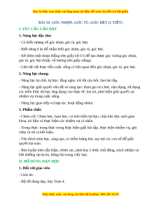 I. YÊU CẦU CẦN ĐẠT 1. Năng l c đ ự c t ặ hù: - Có bi u t ể ư ng ợ v góc nh ề n, góc t ọ ù, góc b t ẹ . - Bi t ế dùng ê ke đ nh ể n bi ậ t ế góc nh n, ọ góc tù, góc b t ẹ . - K t ẻ hêm m t ộ đo n t ạ h ng ẳ trên gi y k ấ ô l ẻ i đ t ể o đ ạ ư c ợ góc vuông góc nh n, ọ góc tù, góc b t ẹ (ho c ặ v buông t ẽ rên gi y t ấ r ng) ắ . - Liên h v ệ i ớ th c ự ti n cu ễ c s ộ ng có ố liên quan đ n góc nh ế n, góc ọ tù, góc b t ẹ . 2. Năng l c chung ự : - Năng l c t ự ch ự , ủ t h ự c: ọ l ng ắ nghe, tr l ả i ờ câu h i ỏ , làm bài t p. ậ - Năng l c gi ự i ả quy t ế v n đ ấ và s ề áng t o: ạ tham gia trò ch i ơ , v n d ậ ng, ụ sử d ng ụ các ki n t ế h c đã h ứ c ọ ng d ứ ng vào t ụ h c t ự , ế tìm tòi, phát hi n gi ệ i ả quy t ế các nhiệm v t ụ rong cu c s ộ ống. - Năng l c gi ự ao ti p và ế h p t ợ ác: ho t ạ đ ng ộ nhóm. 3. Phẩm ch t ấ : - Chăm ch : ỉ Chăm h c, ham ọ h c, ọ có tinh th n t ầ h ự c; ọ ch u khó đ ị c s ọ ách giáo khoa, tài li u và t ệ h c ự hi n các ệ nhi m ệ vụ cá nhân. - Trung th c: ự trung th c t ự rong th c hi ự n gi ệ i ả bài t p, ậ th c hi ự n nhi ệ m ệ v , ụ ghi chép và rút ra k t ế lu n. ậ - Yêu thích môn h c, s ọ áng t o, có ạ ni m ề h ng t ứ hú, say mê các con s đ ố gi ể i ả quy t ế bài toán. - Rèn luy n t ệ ính c n t ẩ h n, chí ậ nh xác, phát huy ý th c ch ứ đ ủ ng, ộ trách nhi m ệ và bồi dư ng s ỡ ự t t ự in, h ng t ứ hú trong vi c h ệ c. ọ II. Đ D Ồ ÙNG D Y Ạ H C Ọ 1. Đ i ố v i ớ giáo viên - Giáo án. - Bộ đồ dùng d y ạ , h c ọ Toán 4. M i