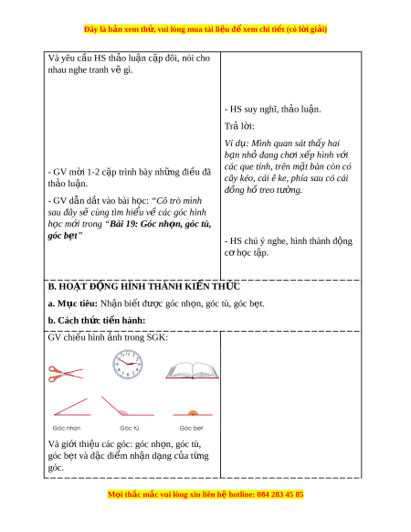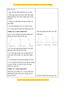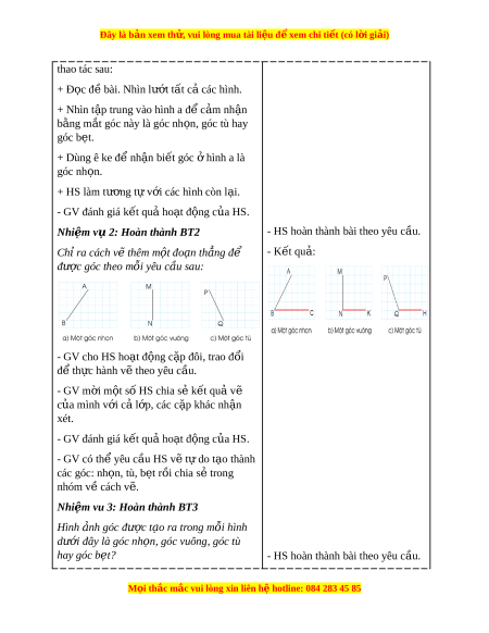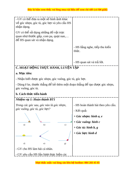 Đây là bản xem th , vu ử i lòng mua tài li u ệ đ xe ể m chi ti t (c ế ó l i ờ gi i ả ) - GV có th đ ể a ư ra m t ộ số hình nh khác ả v góc nh ề n, góc ọ tù, góc b t ẹ và yêu c u H ầ S nh n d ậ ng. ạ GV có th s ể d ử ng ụ nh ng đ ữ v ồ t ậ tr c ự quan nh t ư hư c ớ gấp, com pa, qu t ạ nan,… đ H ể S quan sát và nh n d ậ ng. ạ - HS l ng ắ nghe, ti p t ế hu ki n ế th c. ứ - HS quan sát và tr l ả i ờ . C. HOẠT Đ N Ộ G TH C Ự HÀNH, LUY N Ệ T P Ậ a. Mục tiêu: - Nh n ậ bi t ế đư c góc ợ nh n, góc vuông, góc t ọ ù, góc b t ẹ . - Dùng ê ke, thư c t ớ h ng ẳ đ k ể t ẻ hêm m t ộ đo n t ạ h ng ẳ đ t ể o đ ạ ư c ợ góc nh n, ọ góc vuông, góc tù. b. Cách th c t ứ i n hành ế Nhi m ệ v 1