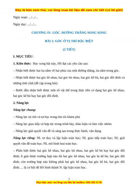 BÀI 1: GÓC Ở VỊ TRÍ ĐẶC BIỆT (2 TIẾT) I. MỤC TIÊU: