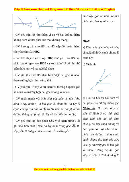 HS thực hiện tìm hiểu hai góc kề nhau thông qua các hoạt động giáo viên yêu cầu.