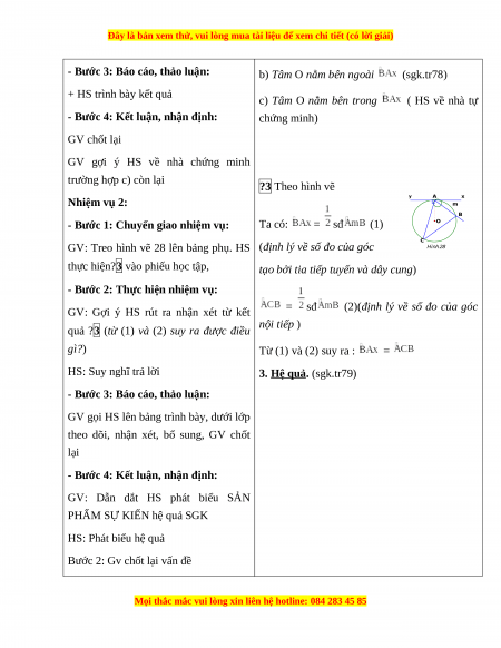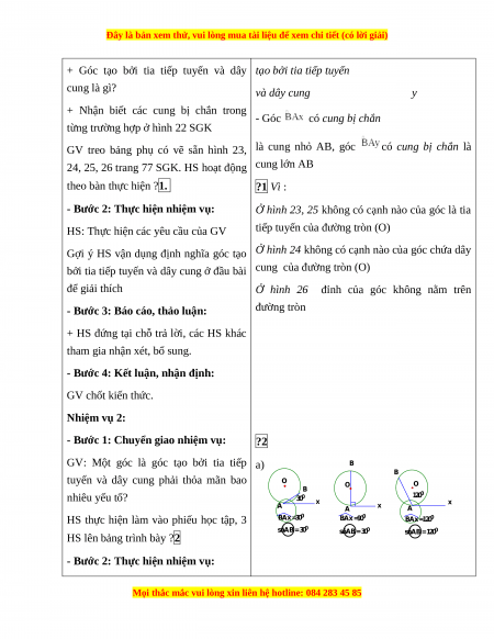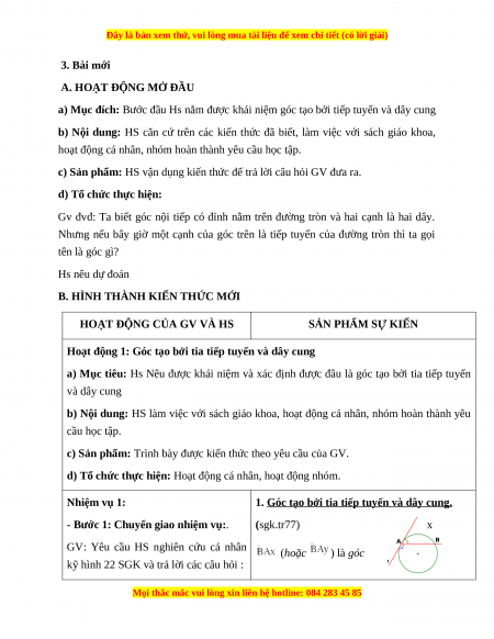 Giáo án Góc tạo bởi tia tiếp tuyến và dây cung Toán 9 Học kì 2