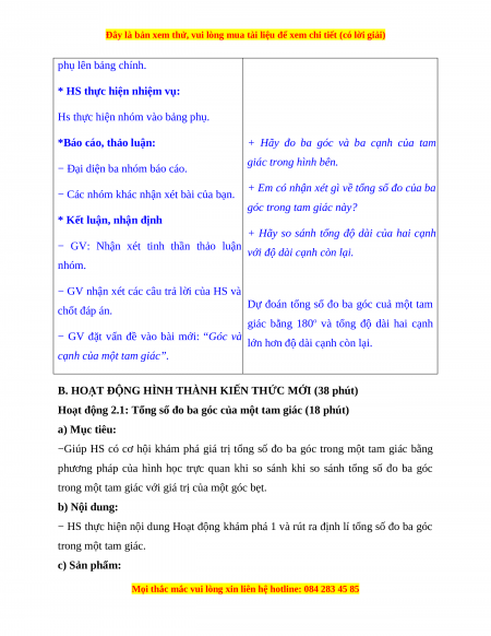Hoạt động 2.1: Tổng số đo ba góc của một tam giác (18 phút) a) Mục tiêu: