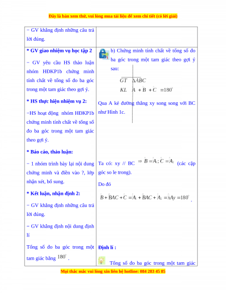 − HS thực hiện nội dung Hoạt động khám phá 1 và rút ra định lí tổng số đo ba góc trong một tam giác. c) Sản phẩm: