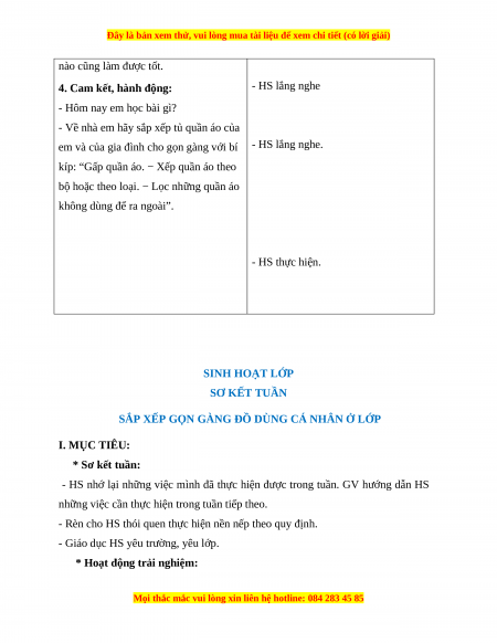 - HS biết sắp xếp đồ dùng sinh hoạt cá nhân gọn gàng.