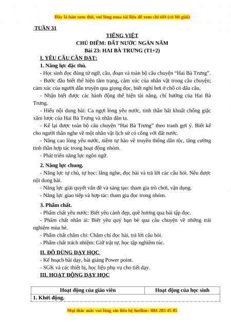 Bài 23: HAI BÀ TRƯNG (T1+2) I. YÊU CẦU CẦN ĐẠT: 1. Năng lực đặc thù.