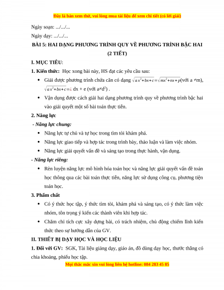 BÀI 5: HAI DẠNG PHƯƠNG TRÌNH QUY VỀ PHƯƠNG TRÌNH BẬC HAI (2 TIẾT) I. MỤC TIÊU: