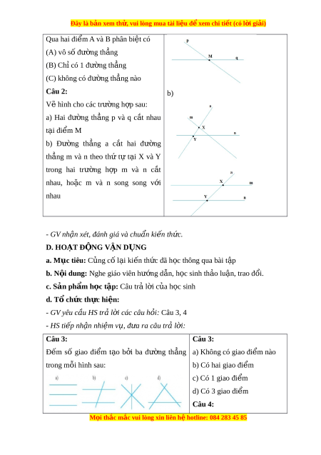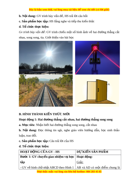 B. HÌNH THÀNH KI N Ế TH C Ứ M I Ớ Hoạt đ ng 1: ộ Hai đư ng t ờ h ng c ẳ t ắ nhau, hai đư ng t ờ h ng s ẳ ong song a. Mục tiêu: Nh n ậ bi t ế hai đư ng t ờ h ng ẳ song song, c t ắ nhau b. N i ộ dung: Đ c