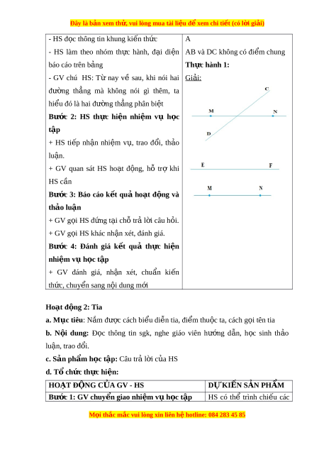 ẳ mà không nói gì thêm, ta hi u đó l ể à hai đư ng t ờ h ng ẳ phân bi t ệ Bư c ớ 2: HS th c ự hi n ệ nhi m ệ vụ h c ọ tập + HS ti p ế nh n ậ nhi m ệ v , ụ trao đ i ổ , th o ả lu n. ậ + GV quan sát HS ho t ạ đ ng, ộ hỗ trợ khi HS c n ầ Bư c ớ 3: Báo cáo k t ế quả ho t ạ đ ng ộ và thảo luận + GV g i ọ HS đ ng ứ t i ạ ch t ỗ r l ả i ờ câu h i ỏ . + GV g i ọ HS khác nh n xét ậ , đánh giá. Bư c ớ 4: Đánh giá k t ế quả th c ự hi n ệ nhi m ệ v h ụ c t ọ p ậ + GV đánh giá, nh n ậ xét, chu n ẩ ki n ế th c, chuy ứ n s ể ang n i ộ dung m i ớ Hoạt đ ng ộ 2: Tia a. Mục tiêu: N m ắ đư c cách ợ bi u di ể n t ễ ia, đi m ể thu c t ộ a, cách g i ọ tên tia b. N i ộ dung: Đ c