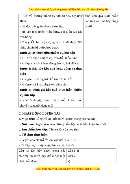 Đây là bản xem th , vu ử i lòng mua tài li u ệ đ xe ể m chi ti t ế (có l i ờ gi i ả ) - GV vẽ đư ng ờ th ng ẳ xy v i ớ tia Ox, Oy như hình nh ả qua slide ho c ặ Hình 3 dán nh ả và trình bày b ng ằ - HS đ c ọ thông tin khung ki n ế th c ứ t ờ A0 - HS làm theo nhóm V n ậ d ng, ụ đ i ạ di n ệ báo cáo trên b ng ả - Chú y: Ở ph n ầ v n ậ d ng ụ này, HS đã đư c ợ GV nh c chu ắ ẩn bị t ở i t ế h c ọ trư c ớ Bư c ớ 2: HS th c hi ự n nhi ệ m ệ v h ụ c t ọ p ậ + HS ti p ế nh n nhi ậ m ệ v , t ụ rao đ i ổ , th o ả lu n. ậ + GV quan sát HS ho t ạ đ ng, ộ h t ỗ r khi ợ HS c n ầ Bư c ớ 3: Báo cáo k t ế quả ho t ạ đ ng ộ và th o ả luận + GV g i ọ HS đ ng ứ t i ạ ch t ỗ r l ả i ờ câu h i ỏ . + GV g i ọ HS khác nh n xét ậ , đánh giá. Bư c ớ 4: Đánh giá k t ế quả th c ự hi n ệ nhi m ệ vụ h c t ọ ập + GV đánh giá, nh n ậ xét, chu n ẩ ki n ế th c, ứ chuy n s ể ang n i ộ dung m i ớ C. HOẠT Đ N Ộ G LUY N Ệ T P Ậ a. Mục tiêu: C ng c ủ ố l i ạ ki n ế th c đã h ứ c t ọ hông qua bài t p ậ b. N i