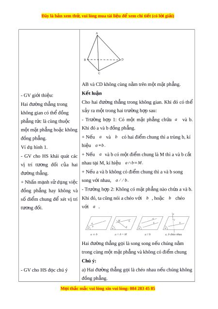 Đây là bản xem th , vu ử i lòng mua tài li u ệ đ xe ể m chi ti t ế (có l i ờ gi i ả ) AB và CD không cùng n m ằ trên m t ộ m t ặ ph n ẳ g. - GV gi i ớ thi u ệ : Kết luận Hai đ n ườ g th n ẳ g trong Cho hai đ n ườ g th n